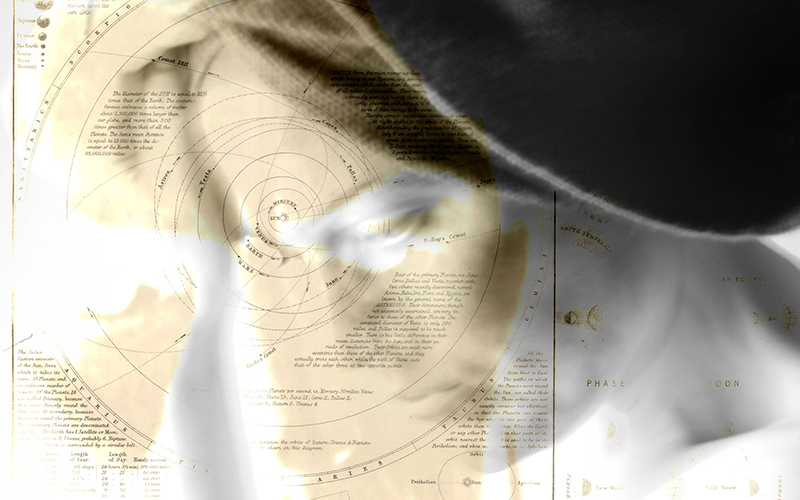 Planetare Kreislinien und Angaben zu den Dimensionen von Sonne oder Sternen legt Isabel Belherdis über geheimnisvoll aussehende Frauenportraits. Dadurch erweitert sie den Kosmos der Weiblichkeit in eine tiefere Dimension, die wir zeitlich nicht fassen können.
