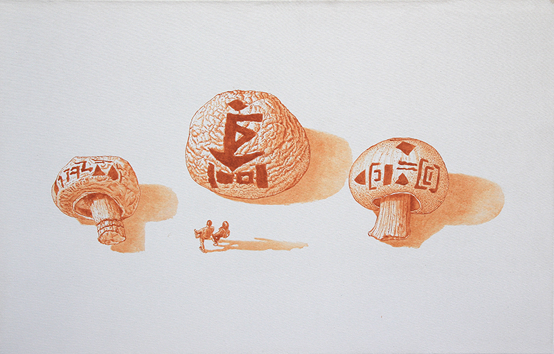Zerfurchtes oder überdimensioniertes Gemüse, das viel Zeit hinter sich zu haben scheint, liegt im Fokus von Gernot Fischer-Kondratovitch. Sinnlich-organisch mit Buchstaben oder geheimen Zeichen übersät oder schattenspendend werden sie zu Objekten, die uns zwar bekannt sind, denen eine andere, uns nicht definierbare, Zeitdimension innewohnt.
