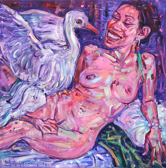 Leichtfüßige wie unbedarfte Jugendlichkeit in malerisch, floralem oder animalen Umfeld, in dem die Zeit still zu stehen scheint, stellt Elisabeth Wedenig in ihren fließenden und doch klaren Bildern dar.