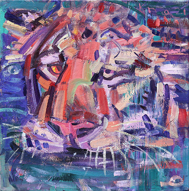 Wie alt die Frau mit der Katze auf ihrem Rücken ist, ist nicht ausmachbar. In breiten Pinselstrichen lässt Guido Katol das Gesicht der jugendlich strahlenden Frau in unbestimmtem Alter – ob der Ring an ihrer rechten Hand etwas vermuten lässt? Auch Guido Katol ist im kaz.-Kalender 2021 vertreten.