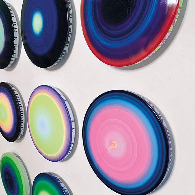 Wie Designer-Wanduhren muten die farbintensiven, leuchtenden Kreise von Alina Kunitsynas Lichtinstallation an. Eher an den Mond erinnern ihre, farb-kontrastierenden Arbeiten mit dem Titel „Cellula“, was wiederum auf Zellen verweist – beides Grundlagen des wiederkehrenden Lebenskreises.