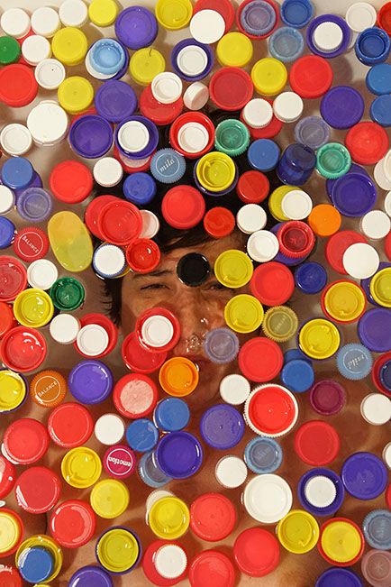 Durch viele bunte Plastikschraubverschlüsse hindurch, die in schäumendem Wasser schwimmen, ist ein Kopf ausmachbar: Martha Laschkolnig und Marie Lenoble bieten als Künstlerinnenduo OneTwoMuch durch geistreich-witzige Darstellungen eine Reflexion zur Lage der Zeit. Das unbeschwert aussehende Foto thematisiert die Verschmutzung der Gewässer und Meere durch Plastik und Chemikalien. Das Bild ist auch im kaz.-Kunstkalender 2021 zu finden.