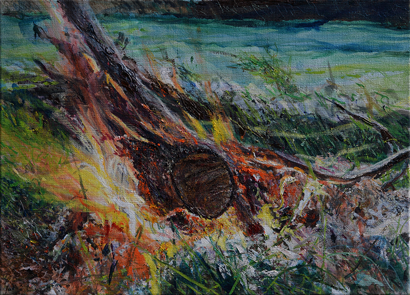 Technisch den impressionistischen Meistern ähnelnd, erforscht Markus Orsini-Rosenberg seit Jahren mit Pinsel und Farbe die Natur, um sie auf Leinwand festzuhalten. Durch die Vergänglichkeit des Brennens hindurch blitzen in den lodernden oder schwelenden Lagerfeuern dynamische Momente von ungeahnten Pastellfarben.