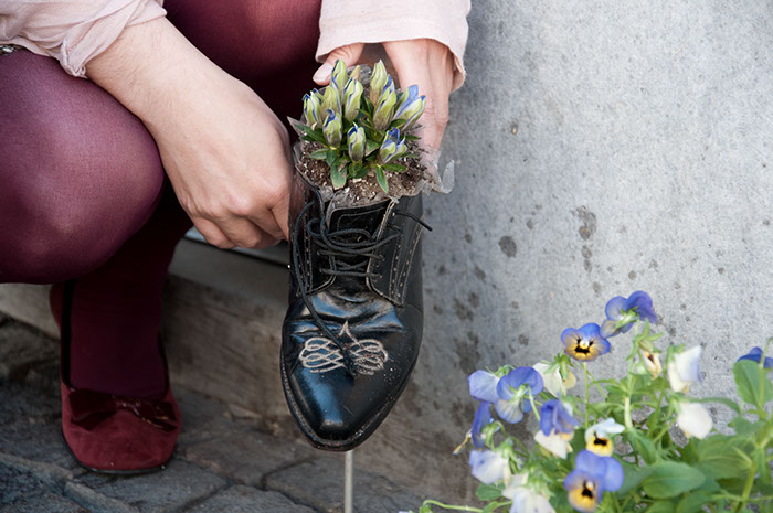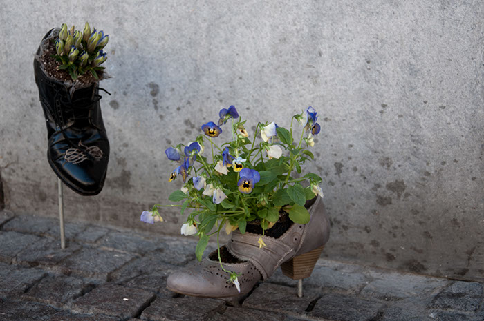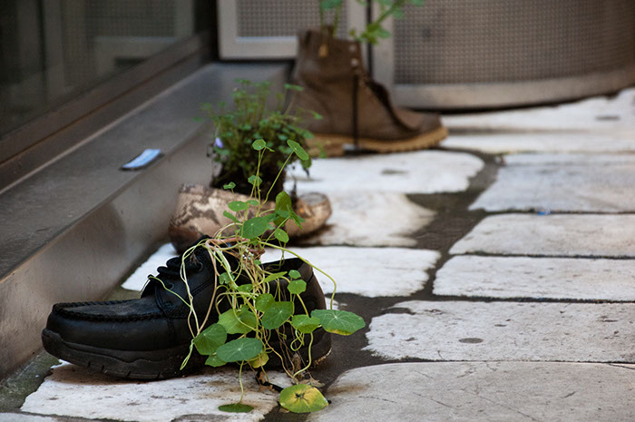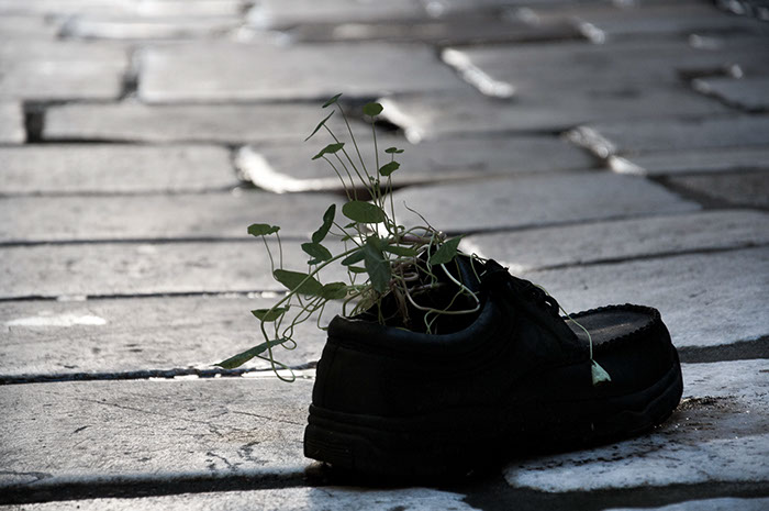 Begleitend zu der Ausstellung Bosnische Wege im Kunstraum Villach, wo Kriegsvisionen der Künstlerin Ida Srkalovic, (Absolventin der Kunstakademie Sarajevo) gezeigt werden, sind die Schuhe sowohl eine Ermahnung an das Vergessen (wo Mensch war wird wieder Natur) oder gleich dem Koffer ein Bild des Fortgehens, des Auseinandergehens oder Wartens auf Aufnahme.